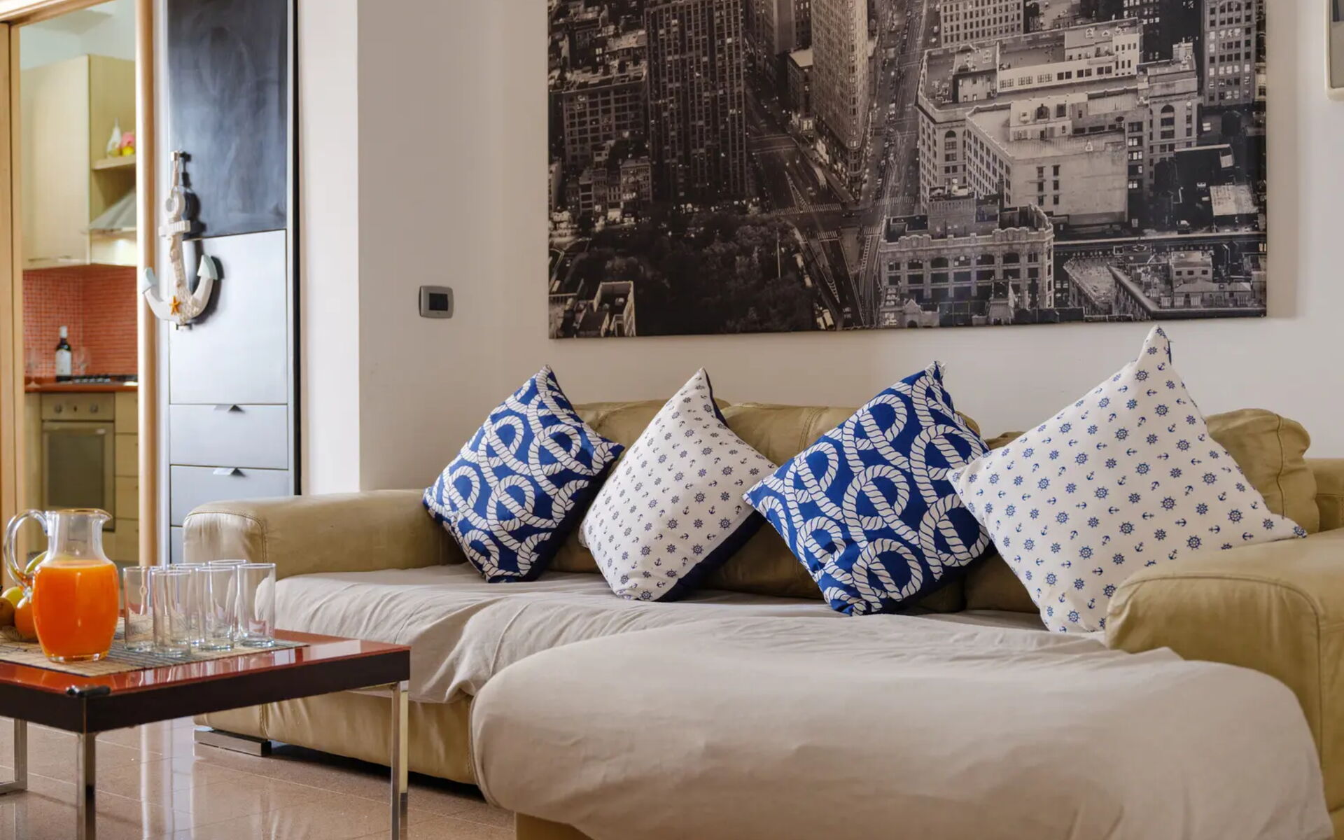 Comprising a living area with a leather sofa with peninsula, TV and brunch area, a separate modern kitchen equipped with every comfort including a refrigerator, oven, toaster, and books on Salento cuisine, a double bedroom, a twin bedroom, and a bathroom complete with a crystal shower.