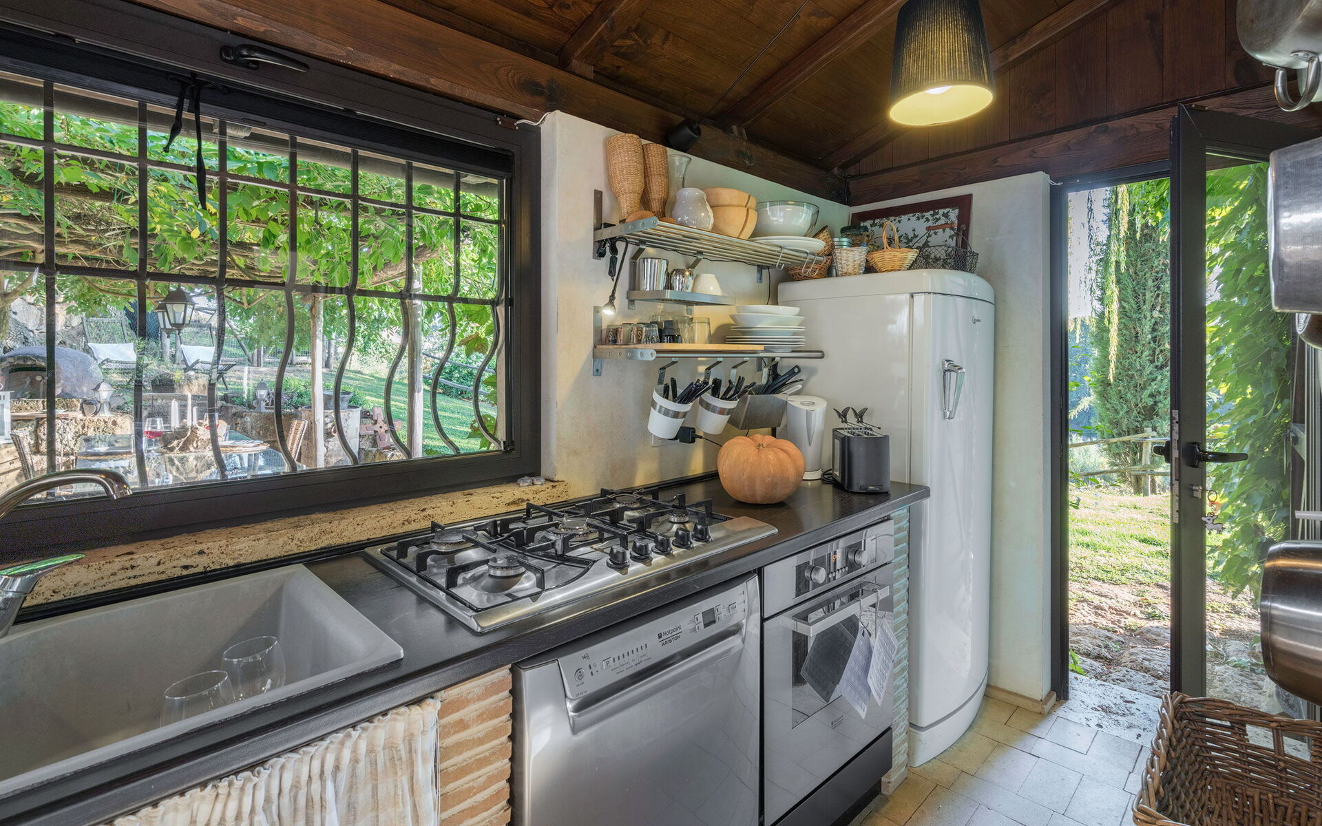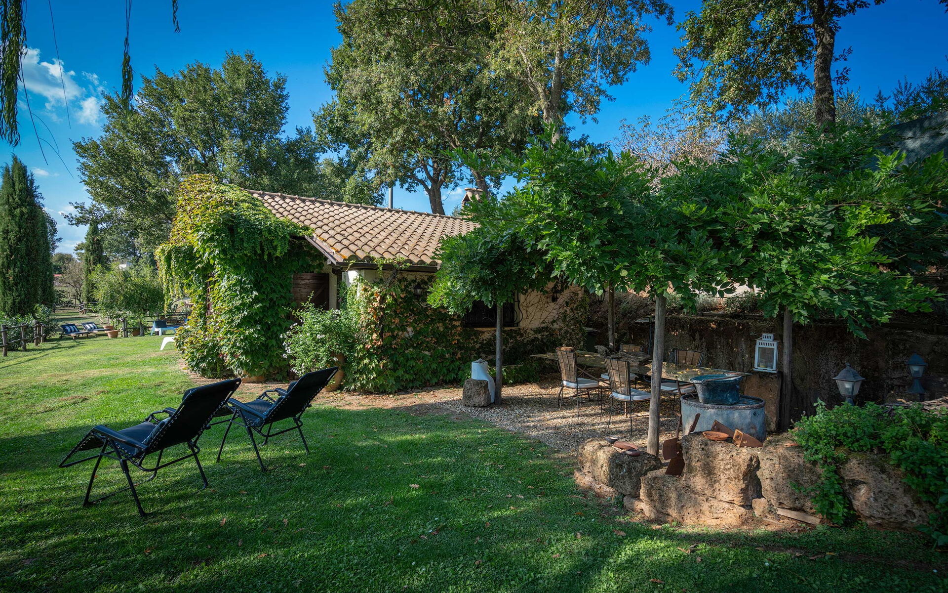 The farmhouse is arranged on one level, furnished with great care and elegance, with a garden equipped with an outdoor veranda, designed for outdoor dining and ideal for enjoying the surrounding landscape. Wood-fired oven available.