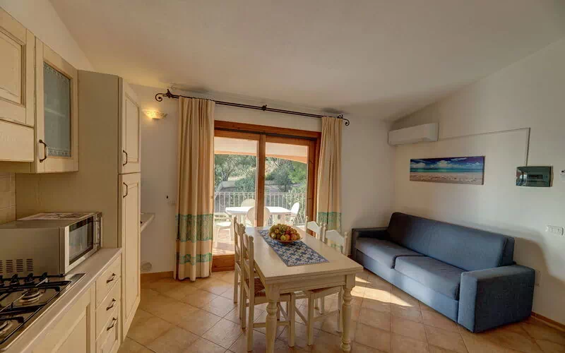 The flat has a living room with kitchenette and double sofa bed, double bedroom, bathroom with shower. Air conditioning is available in the living room, wifi internet. Equipped balcony or patio. Although the flats are of the same type, they may differ in terms of furnishings and equipment. There is a penalty of 50.00 for failure to clean the kitchenette and a further 50.00 for failure to dispose of waste. capsule coffee machine (only capsules sold at the reception desk may be used)