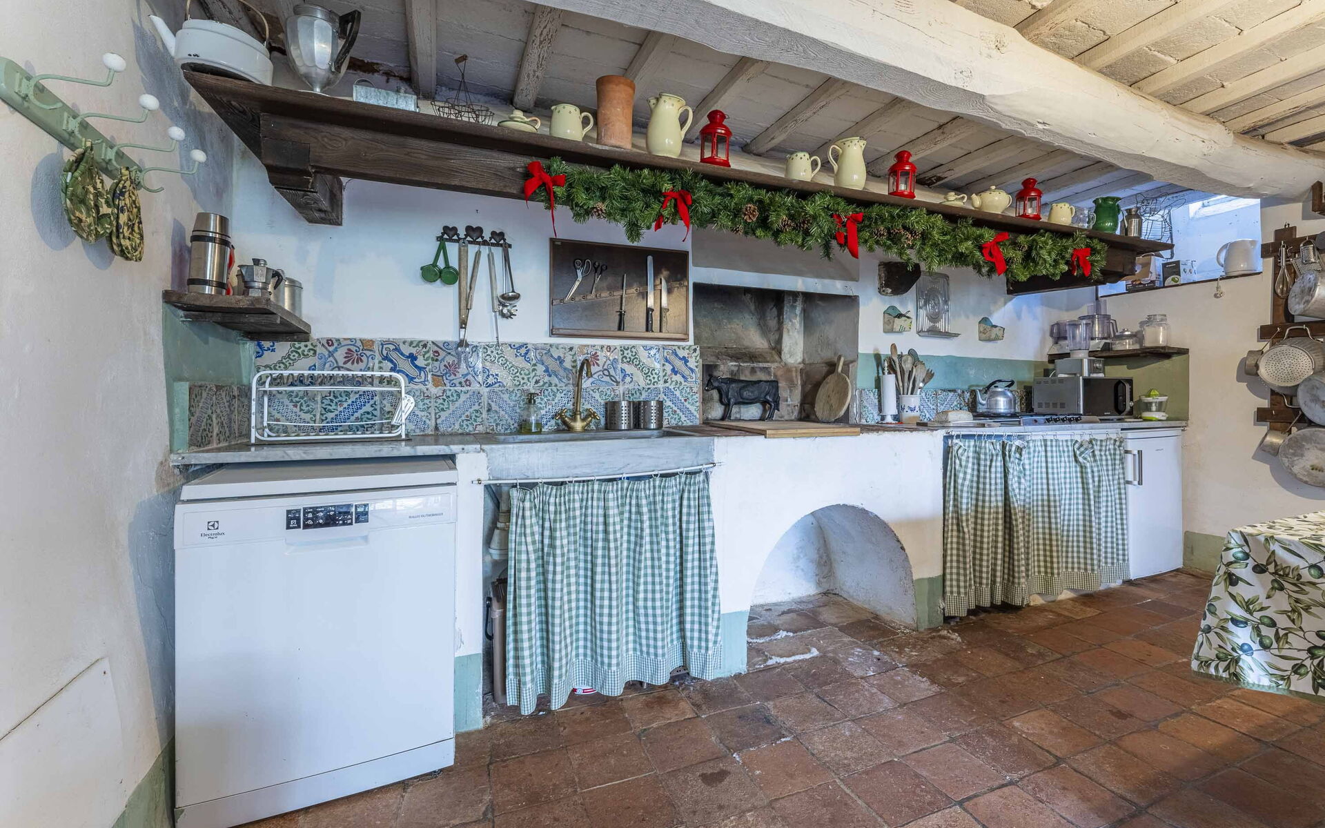 You will find a spacious kitchen on the ground floor, a well-equipped kitchen with dishwasher and microwave, furnished with a large table for eating all together. On the slightly raised floor you will find the living room with television, sofas and armchairs, and games for children.