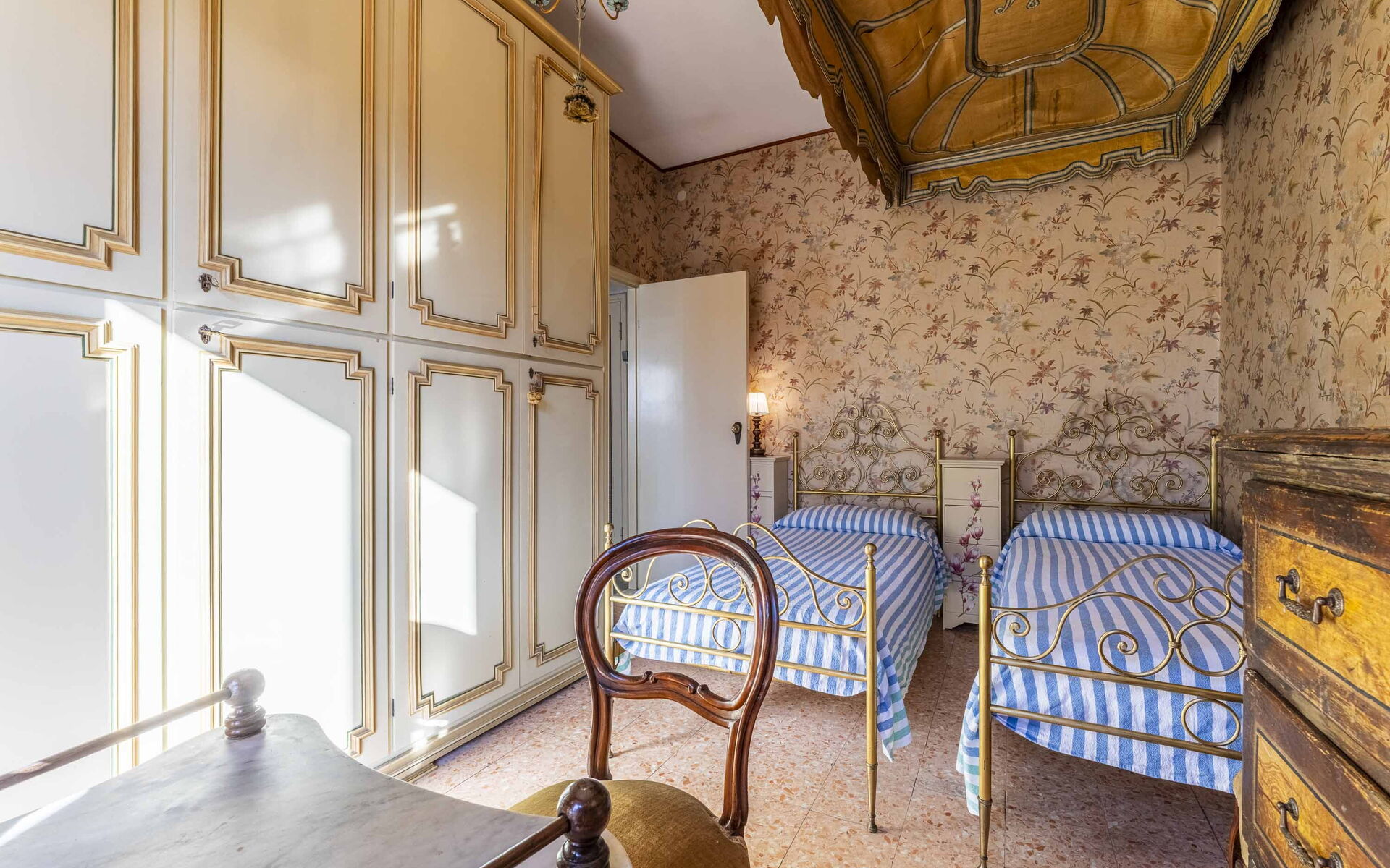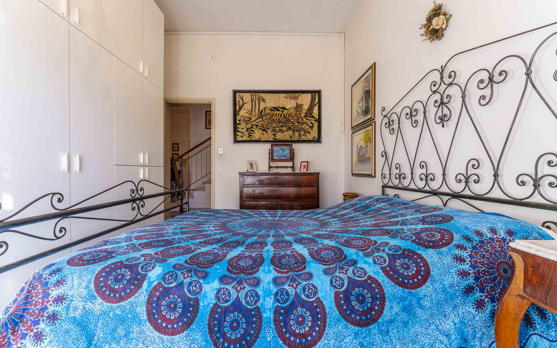On the second level, reached by a marble staircase, you will find the kitchen with dining room and TV room with access to the balcony. The sleeping area features two double bedrooms and one twin bedroom with 2 single beds. Present are two bathrooms with bathtubs.