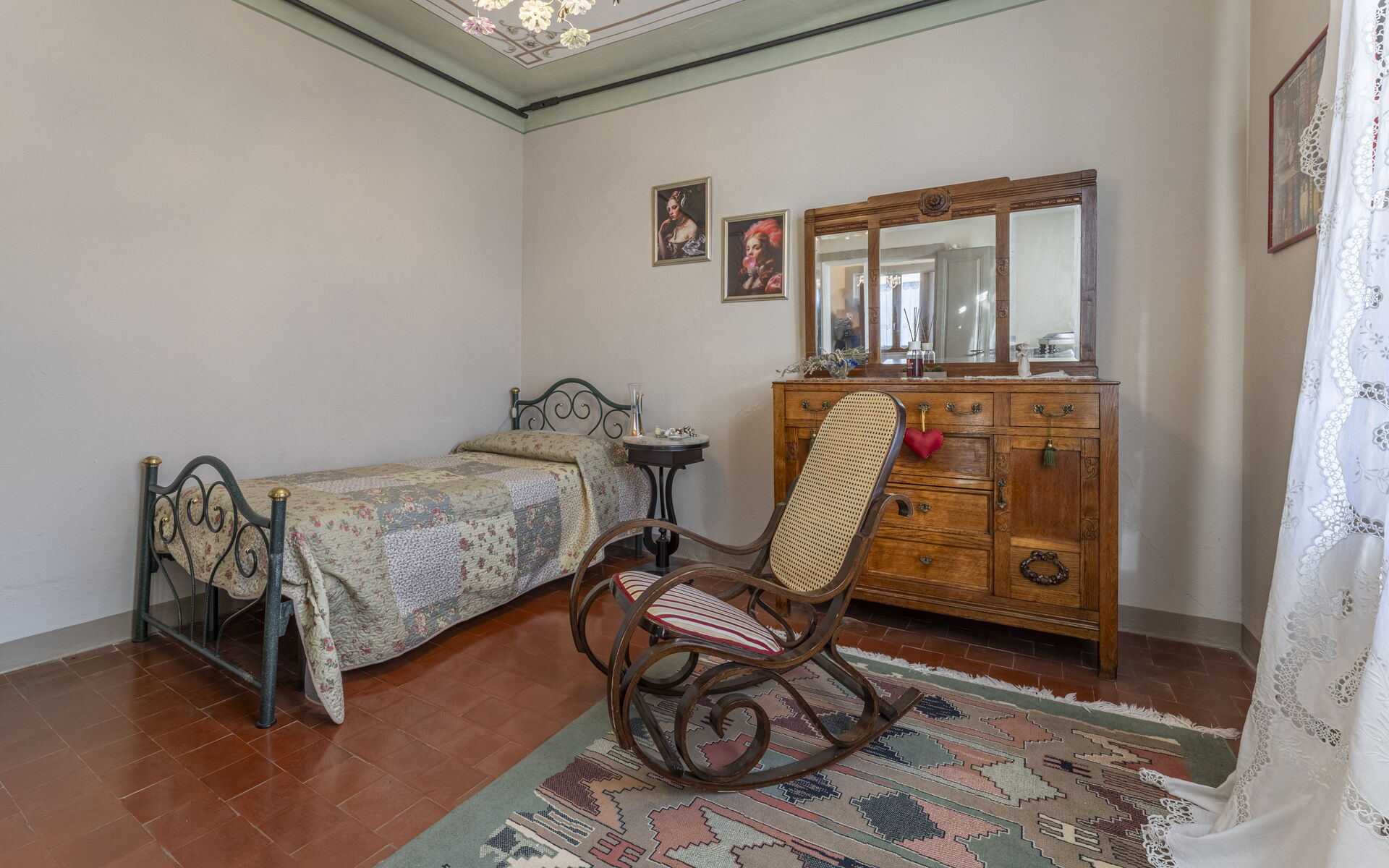 A flight of stairs leads us to the first floor, where we find 3 bedrooms, one double and two singles with one bed each.