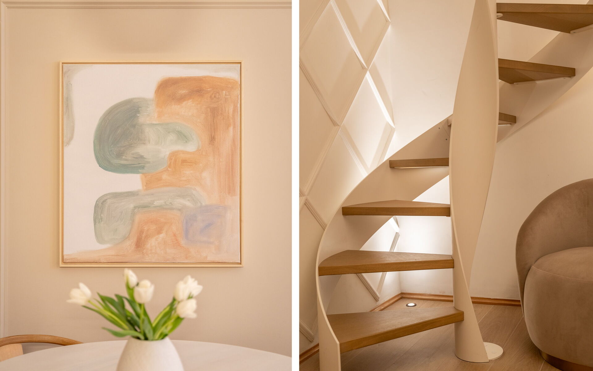 Two-level apartment consisting of kitchenette, bright living room with double sofa bed overlooked by a loft with double bed, walk-in closet, bathroom, reached by spiral staircase