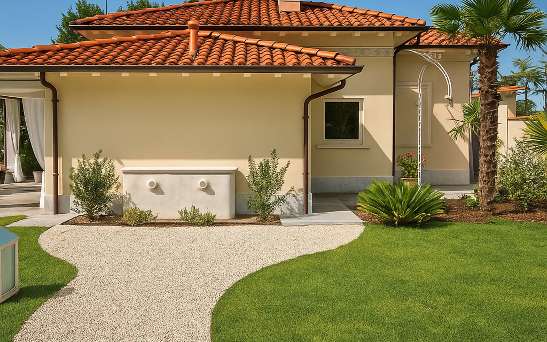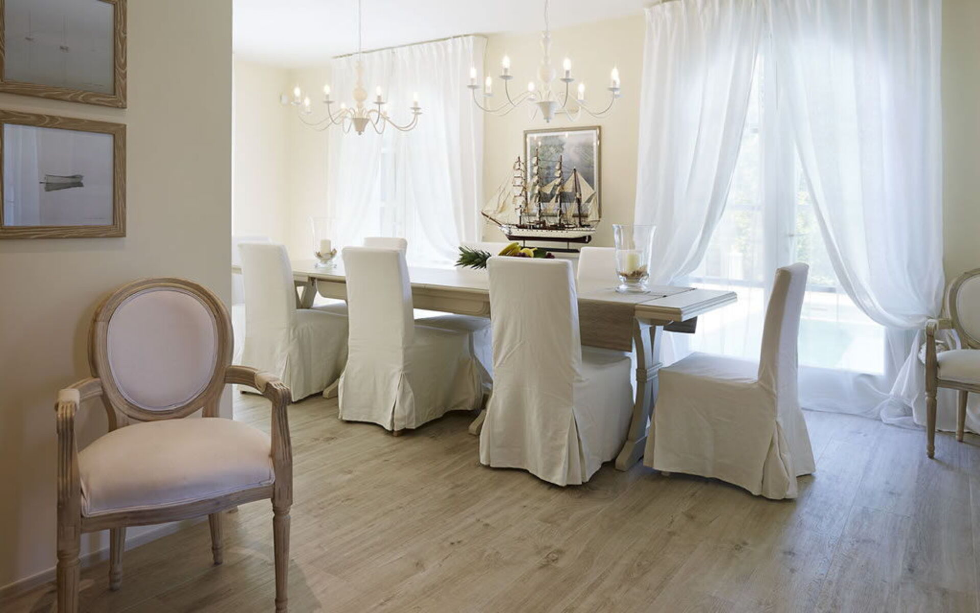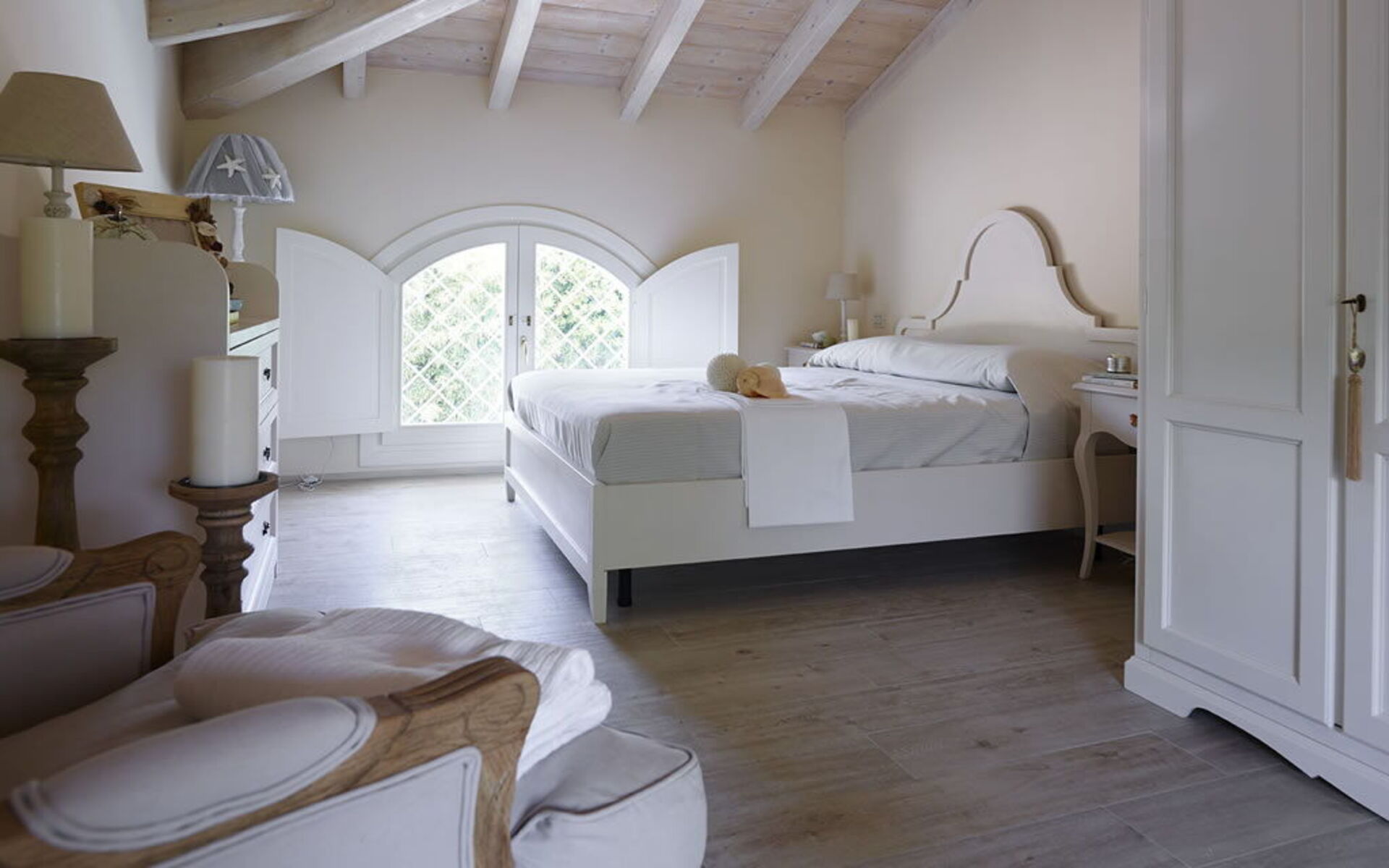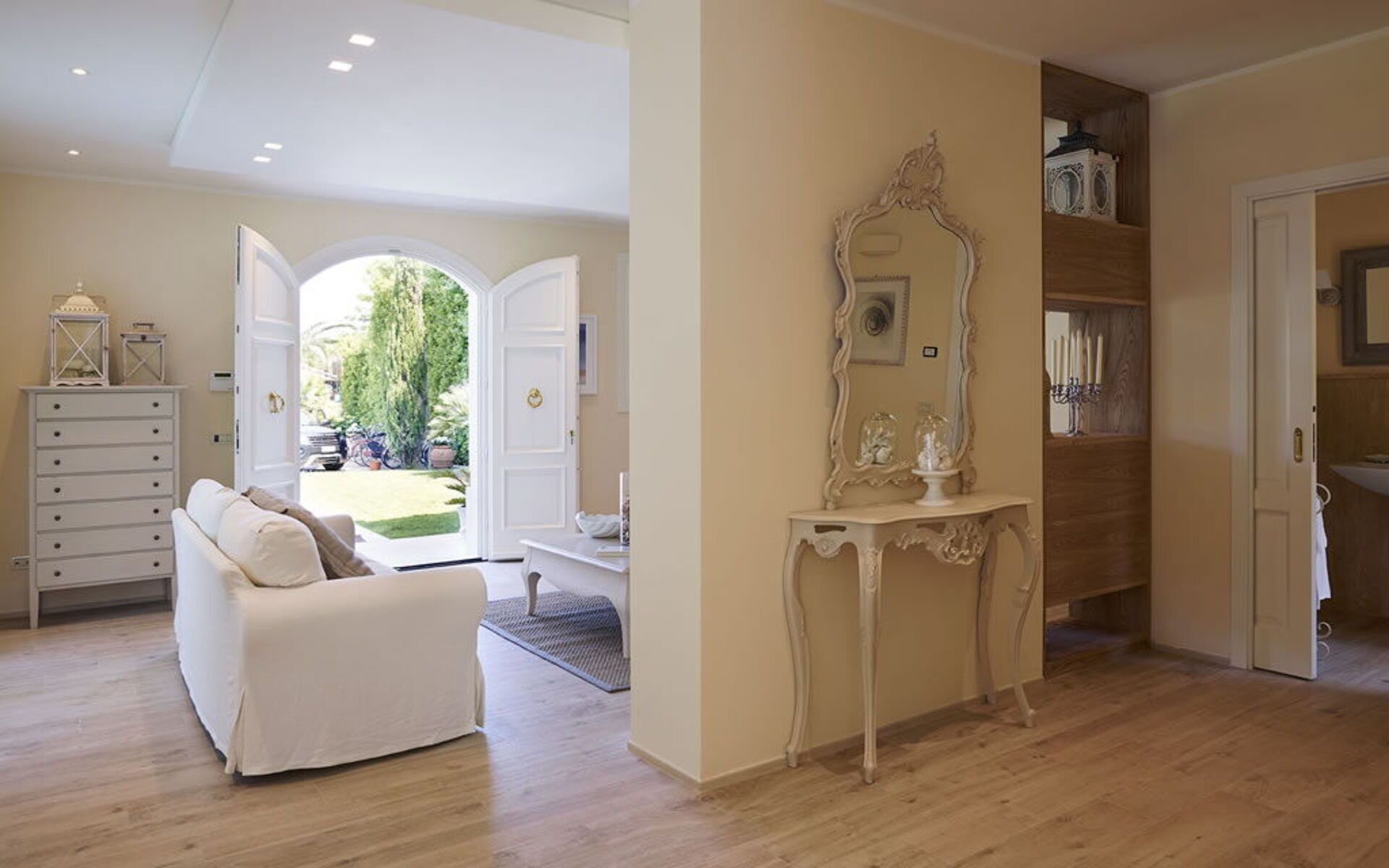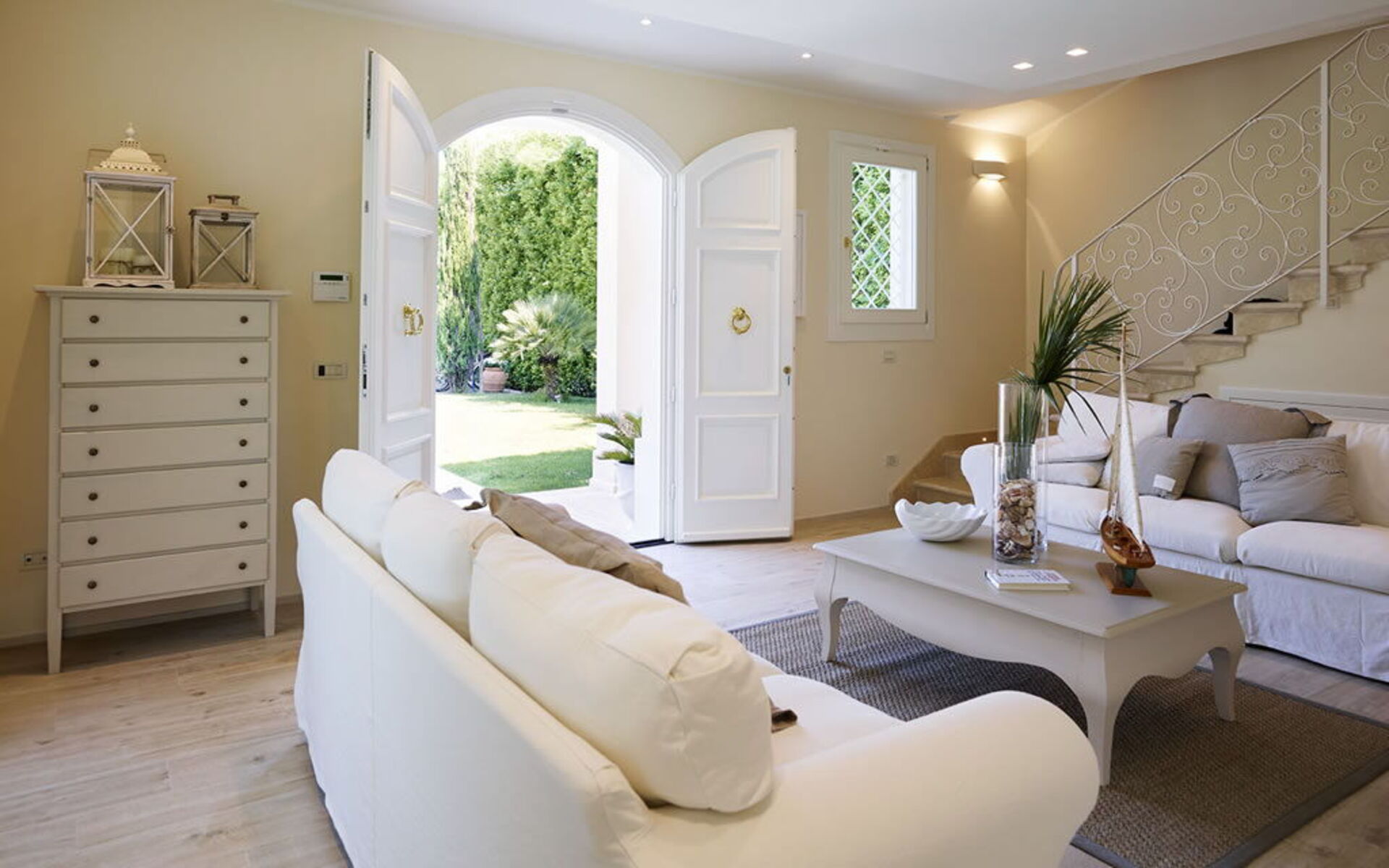 Designed to host up to 16 people, the two villas are connected by a wide green space that guarantees both privacy and conviviality. At the heart of the property is a large wooden loggia with exposed beams—a true outdoor living room featuring cozy sofas, armchairs, and a dining area—ideal for enjoying moments of pure relaxation in the shade or under the stars.