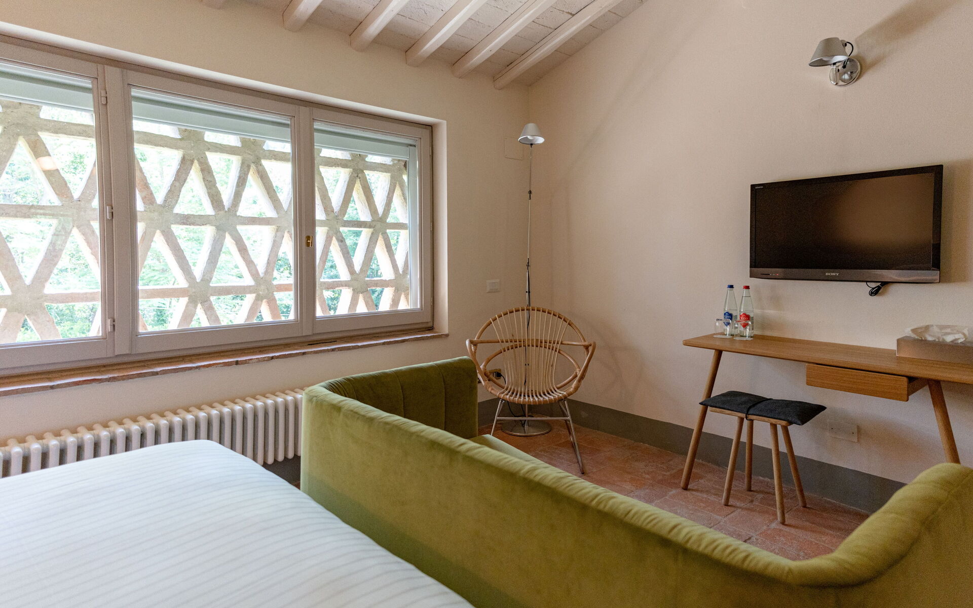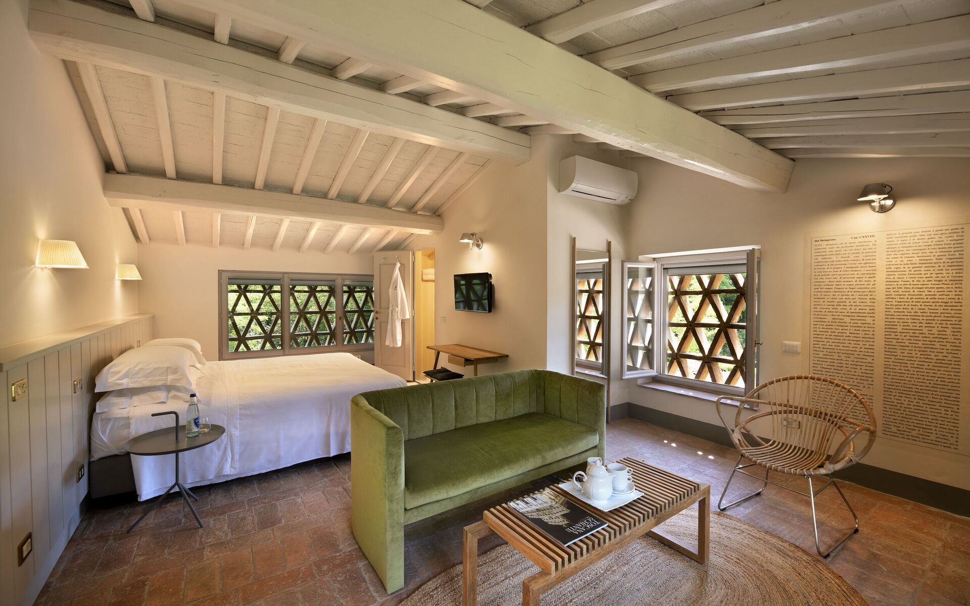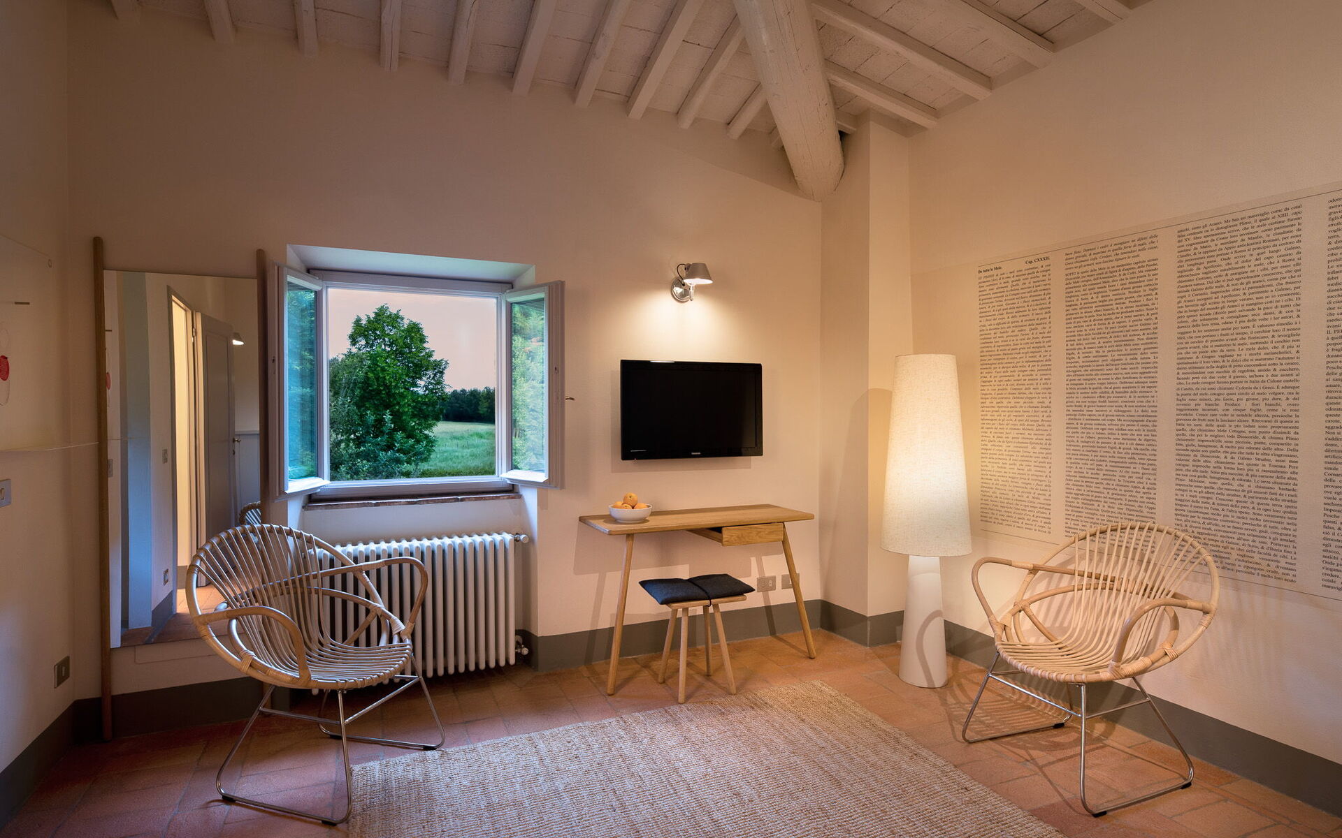 The farmhouse is divided into 4 flats with separate entrances. The accommodations are distinguished by a fresh, contemporary style, with bright rooms and Italian-designed furnishings that combine comfort and refinement. Each room is enriched with elegant graphics inspired by the botanical illustrations of the 16th-century naturalist Gherardo Cibo, creating a harmonious dialogue between art, nature and hospitality.