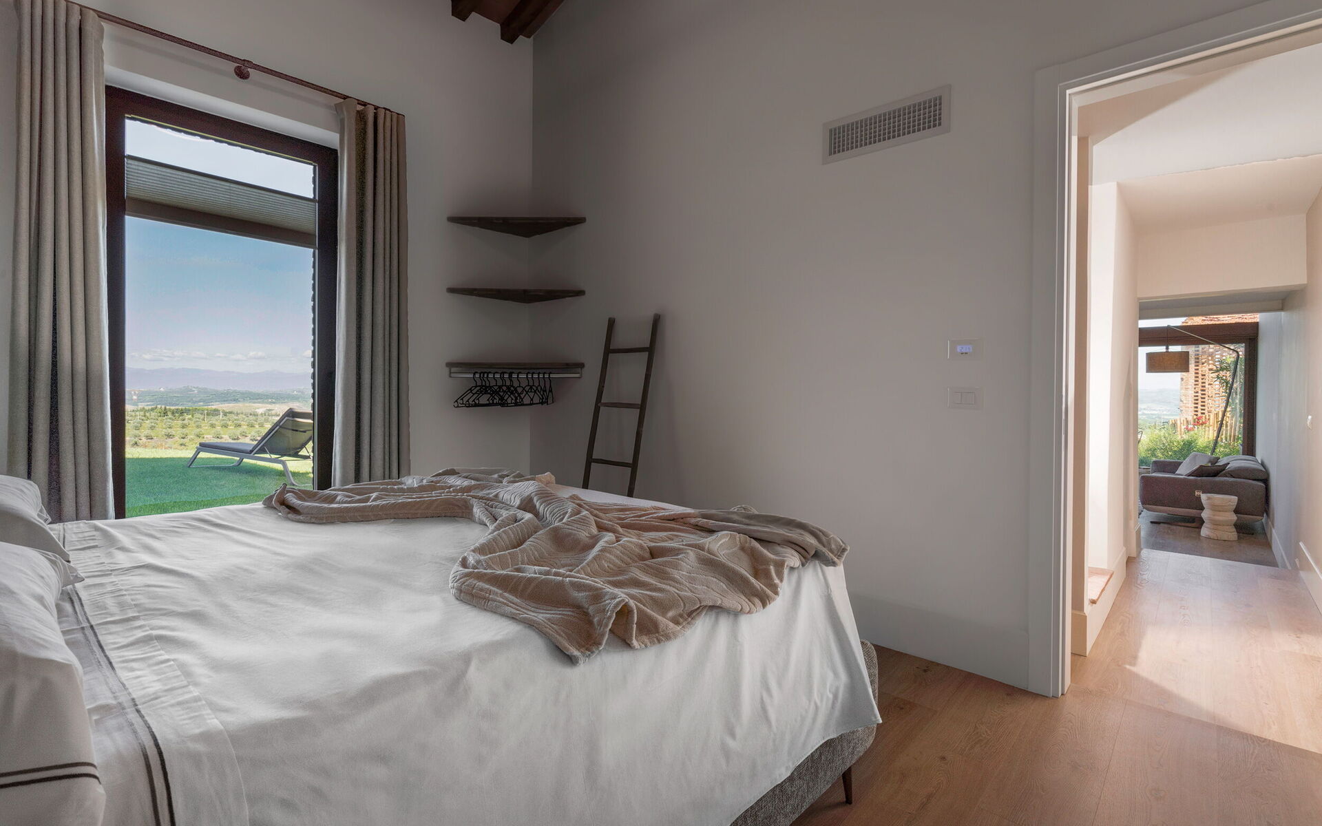 The outdoor swimming pool, in a panoramic position, is heated. The Spereto property is in a strategic position with a beautiful view of the countryside and the historic village of Montaione. Each outdoor space is private and cared for with particular attention to detail. The shared swimming pool is surrounded by a refined sun terrace with outdoor furniture and an umbrella for each unit. The swimming pool area is completed by toilets, an outdoor shower and outdoor kitchen. Uncovered parking inside the property. No cars are allowed inside the Borgo di Spereto, each guest can enter to unload their luggage with a golf cart.