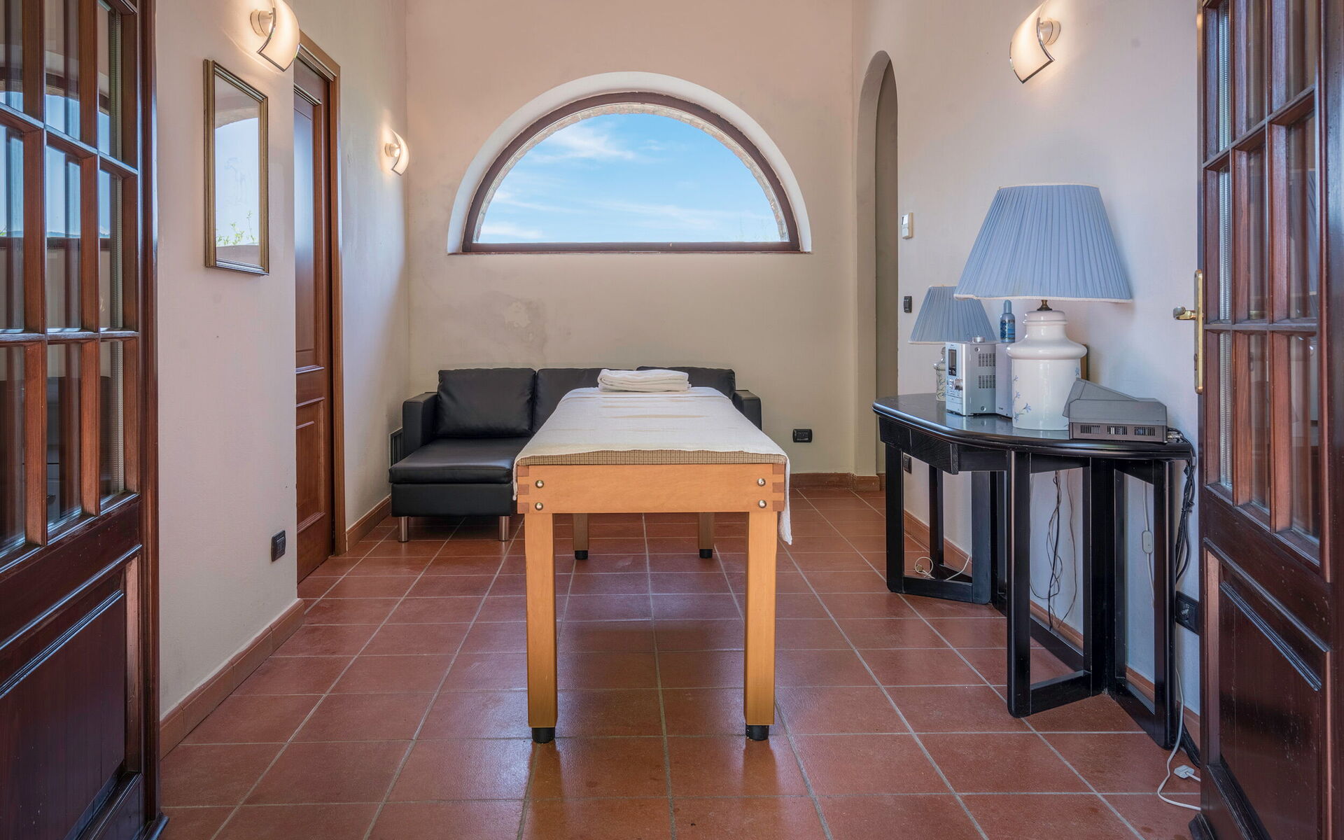 On the first floor: double bedroom with two bathrooms: one with shower and one with bathtub. On the opposite side of the floor a double bedroom with open terrace and bathroom with shower and tub (outside the room).