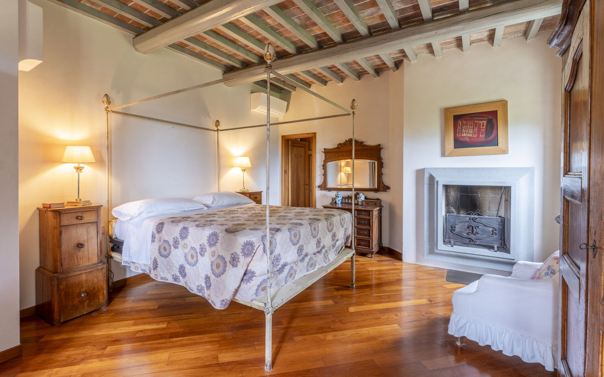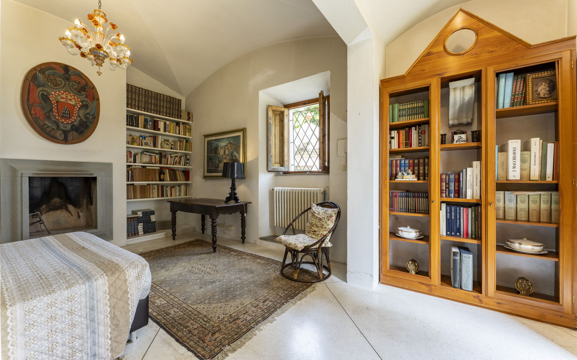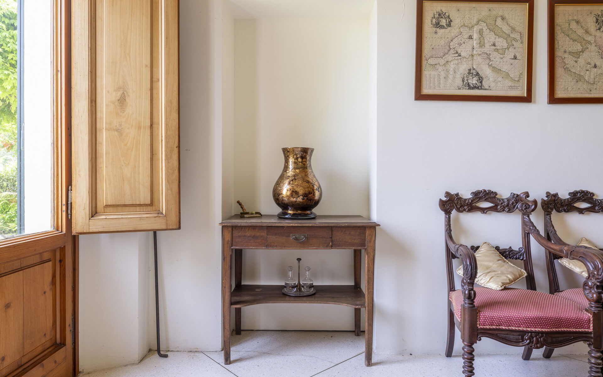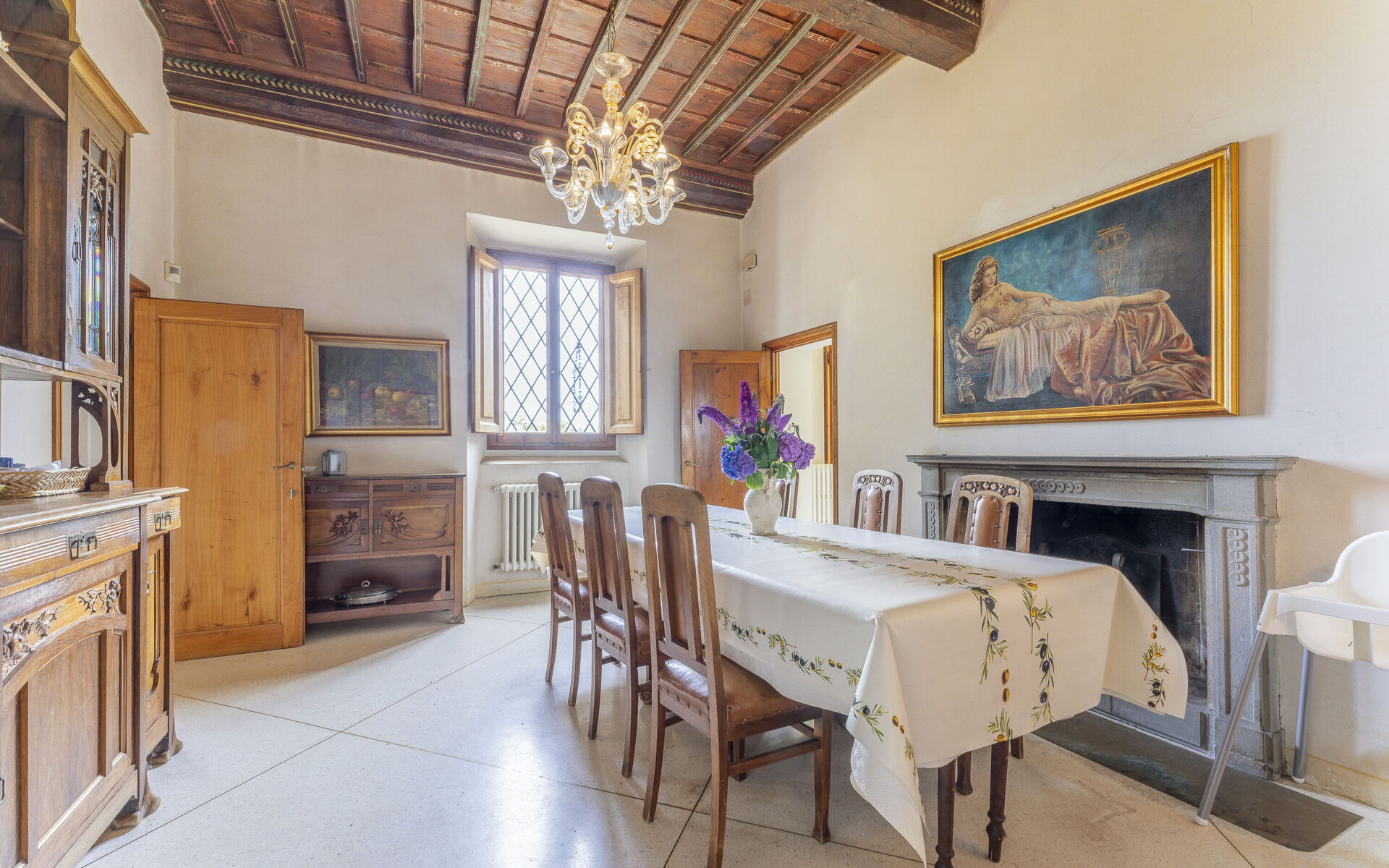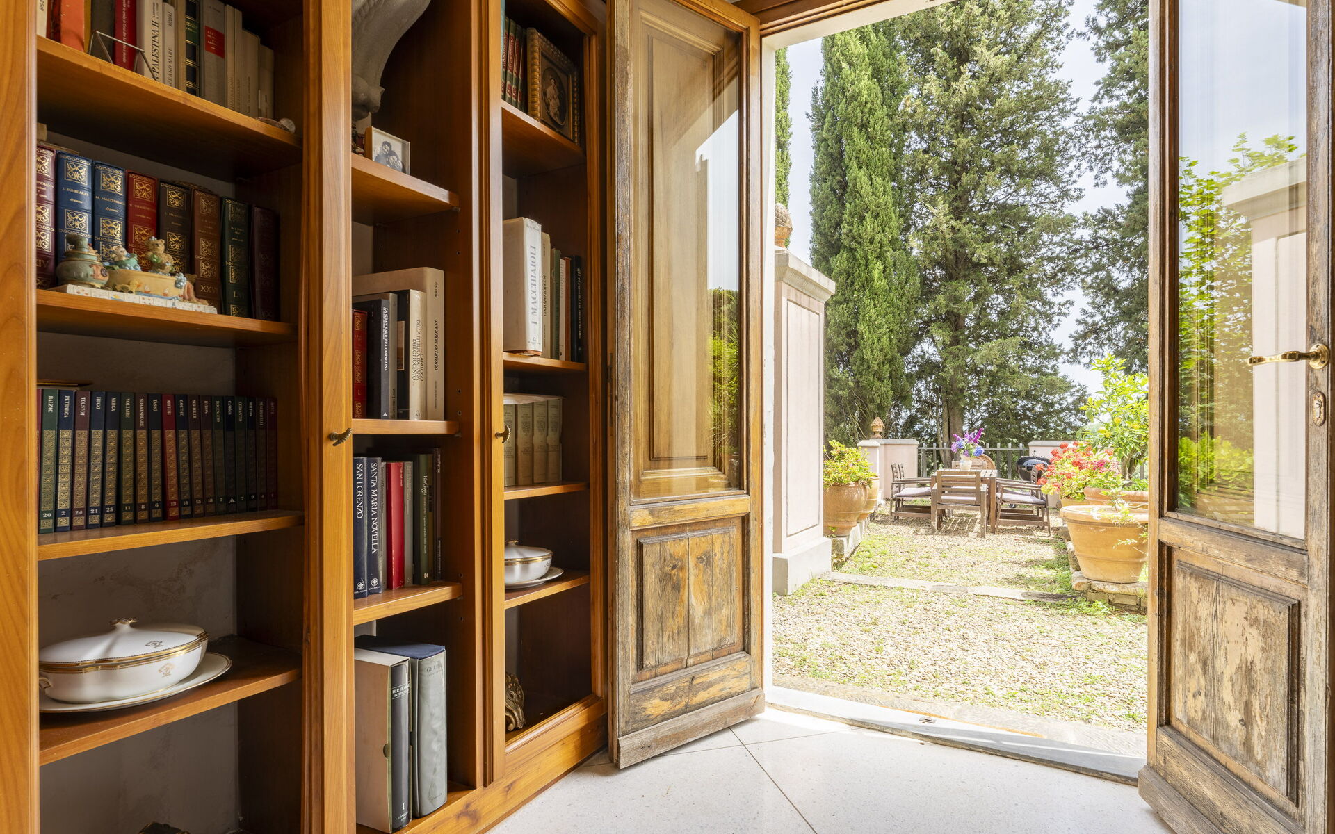 The interior spaces are enriched with antique furnishings that give character to the rooms. The reading area in the large living room offers villa guests the opportunity to relax after a nice swim in the pool, or a walk along the hiking trails that start from the property.
