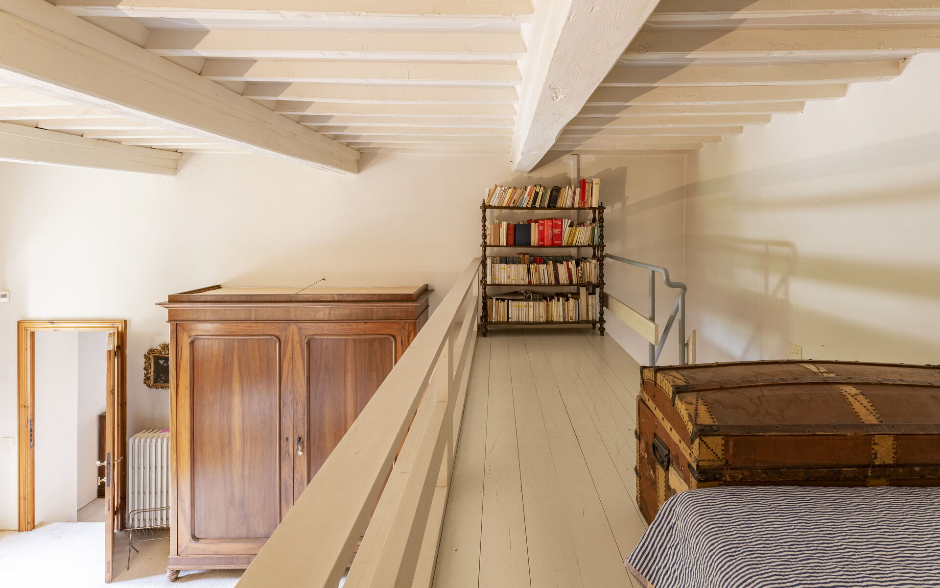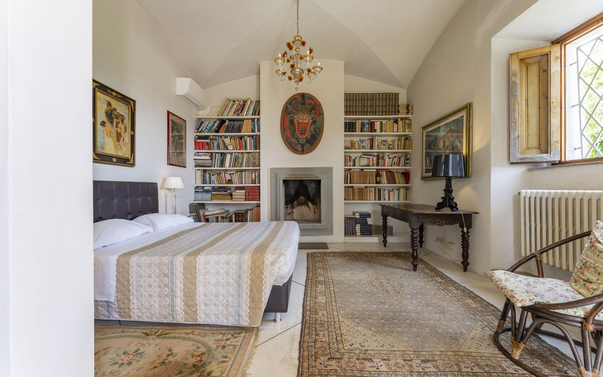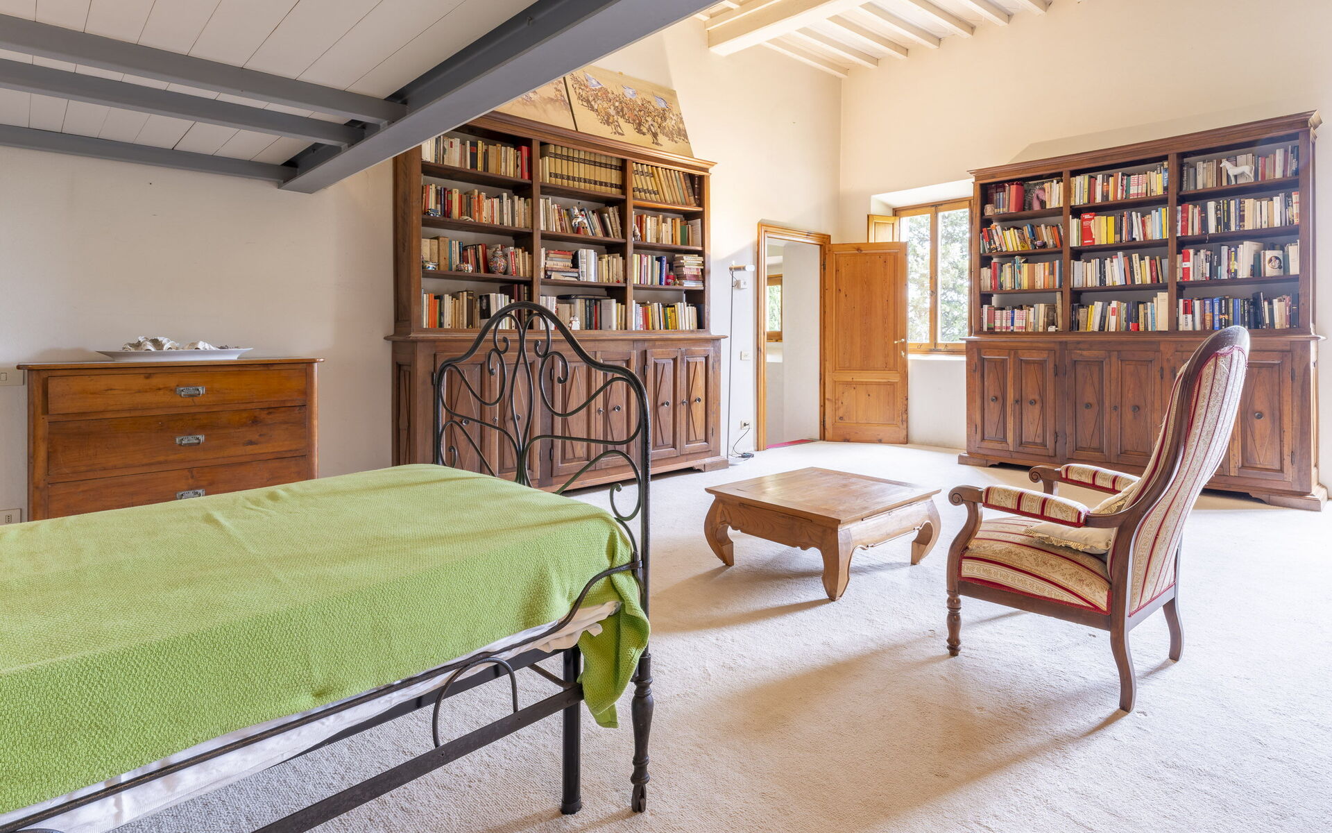 The sleeping area consists of 3 double bedrooms, 2 bedrooms with en-suite bathrooms: one with shower and the other with bathtub, there is another bathroom. Two more French beds are located in the library room with access to the shared bathroom.