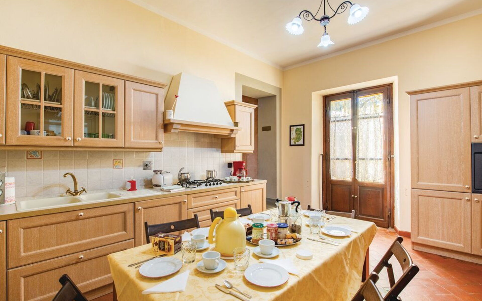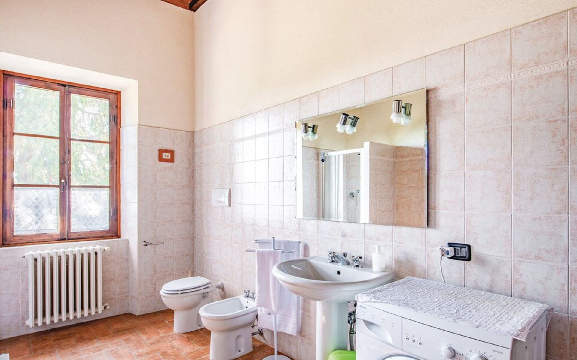 On the ground floor: entrance; large dining room (fireplace) open on the living room with satellite TV; kitchen with four burner stove, oven, fridge freezer, microwave, coffee maker, dishwasher; 2 double bedrooms; 1 bedroom with a french- size bed; 1 bathroom with shower, toilet / bidet; 1 bathroom with toilet and bidet.